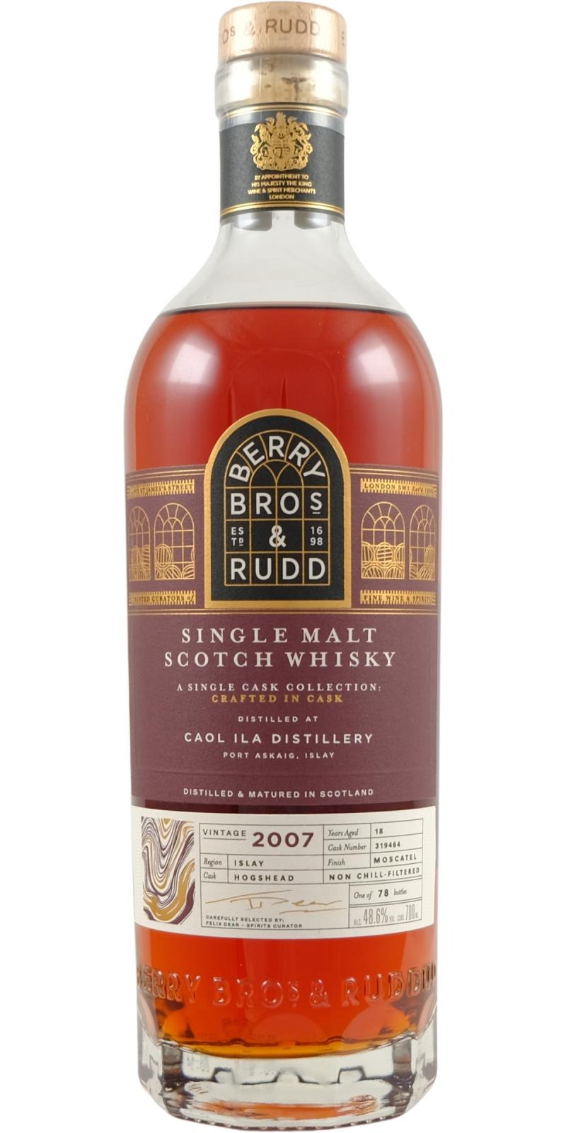 Deze Caol Ila werd gedistilleerd in 2007 en in 2025 gebotteld, na 18 jaar rijping met een bijzondere finish op Moscatel-vaten. Het resultaat is een krachtige Islay single malt waarin rokerige turf en maritieme tonen prachtig samensmelten met de zoete en fruitige invloeden van Moscatel.