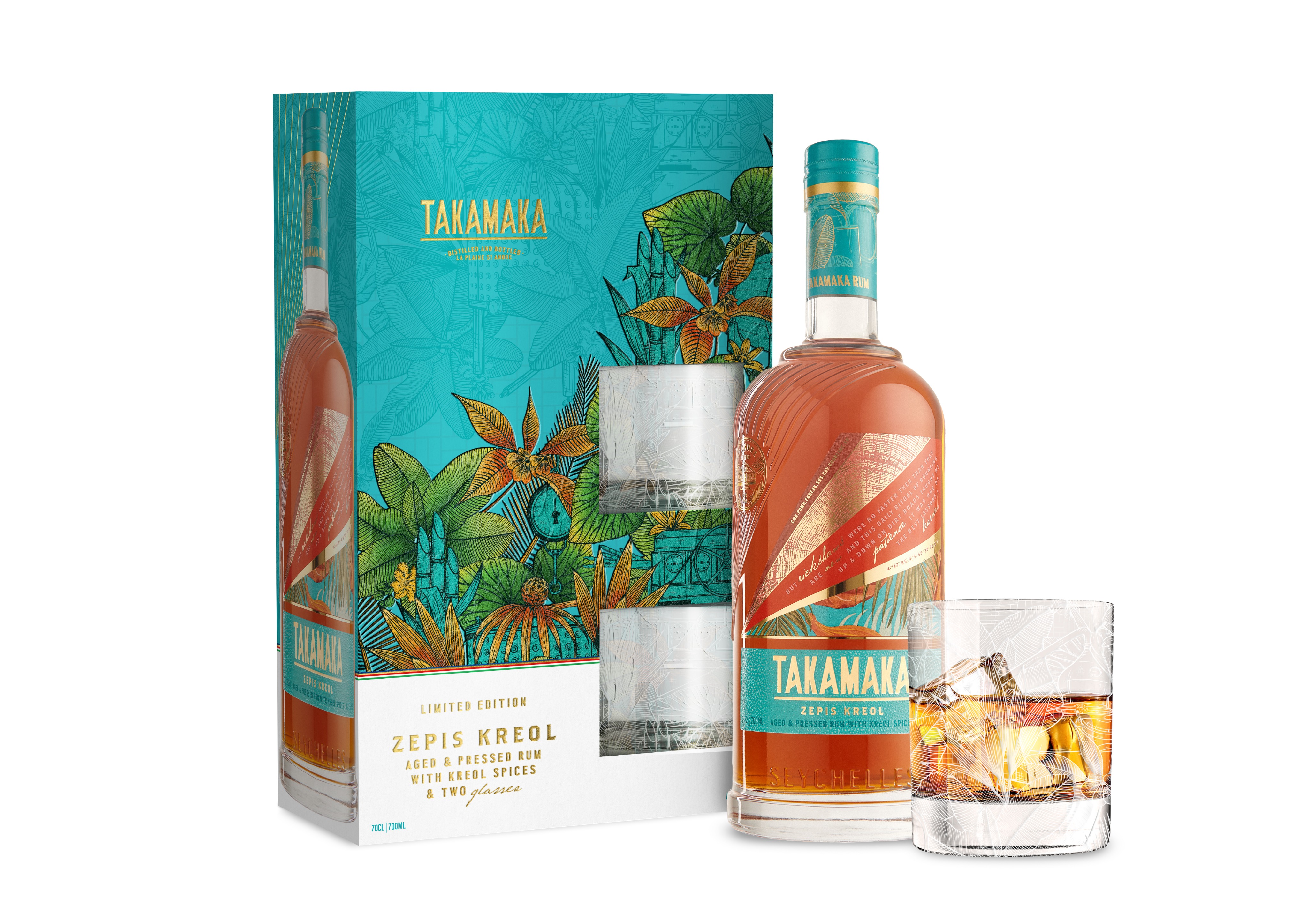 Een blend van pot en continu distillaat, die is gehuwd met lokale kruiden en vervolgens geblend met een 8-jaar oude Foursquare rum. Naast de fles zitten er een kleurrijke omdoos en 2 gegrafeerde Seychelle glazen bij.